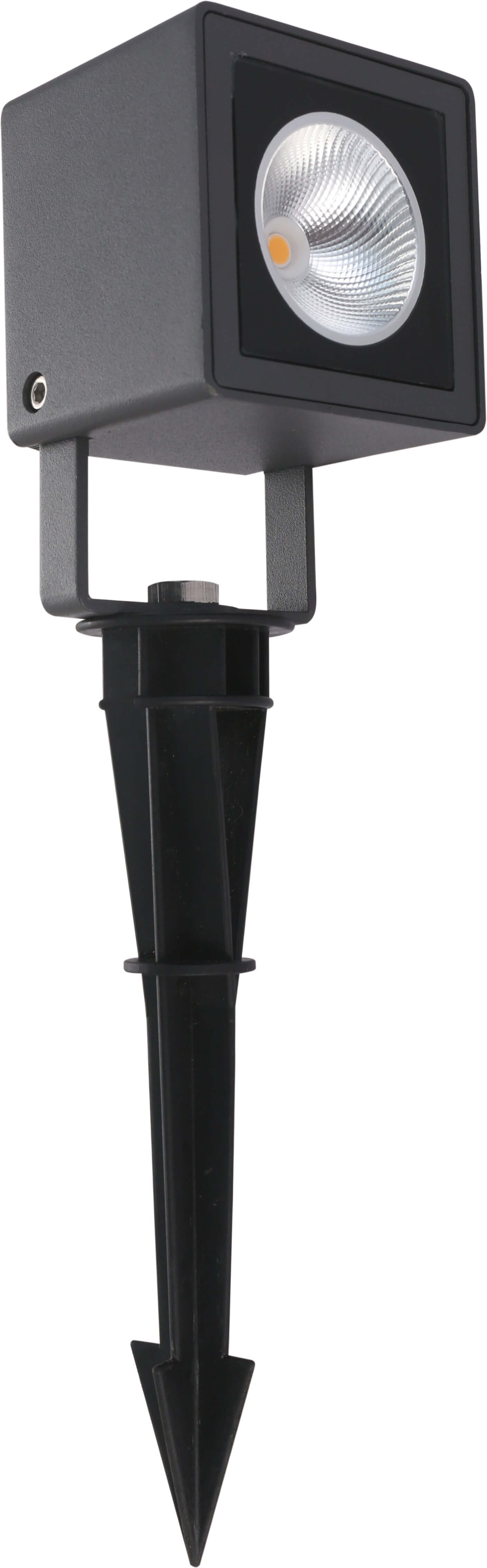 Proyector intemperie c/estaca, LED 6W, 3000K, blanco cálido, 420lm, 55º. Cuerpo construído en inyección de aluminio color gris grafito, difusor en cristal templado. Tornillería en acero inoxidable, junta de cierre siliconada. Con led driver integrado 240V. IP 54 Medidas: 80 x 70 x h 310 mm