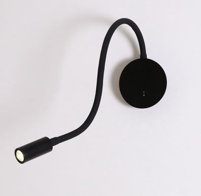 Aplique de pared inalámbrico LED 3W, 3000K blanco cálido, construido en aluminio terminación negro mate, con fuente integrada, interruptor en la base y puerto de carga USB.