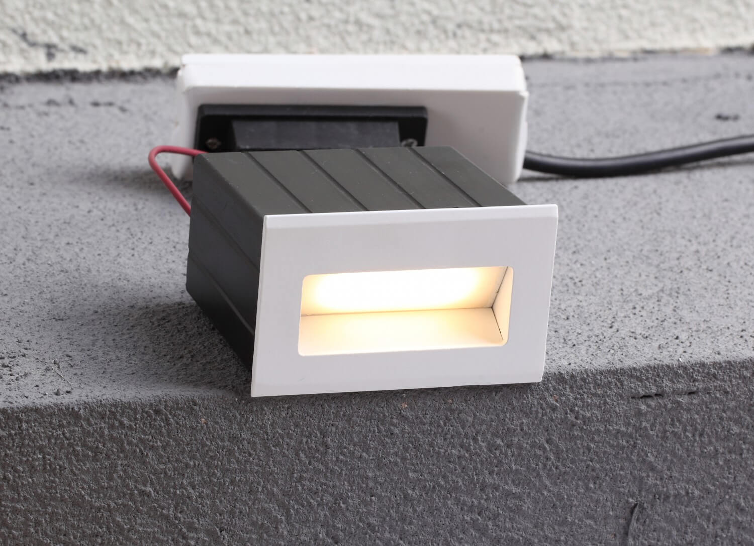 Luminaria de empotrar en muro, LED 3W, 3000K, blanco cálido, 90lm. Cuerpo construído en inyección de aluminio color gris grafito y difusor en vidrio transparente, con tornillería en acero inoxidable, junta de cierre siliconada. Con led driver integrado 240V. IP 65 Medidas: 80 x 50 x 60mm