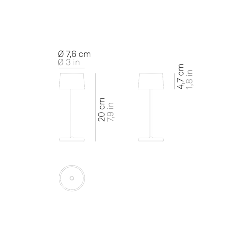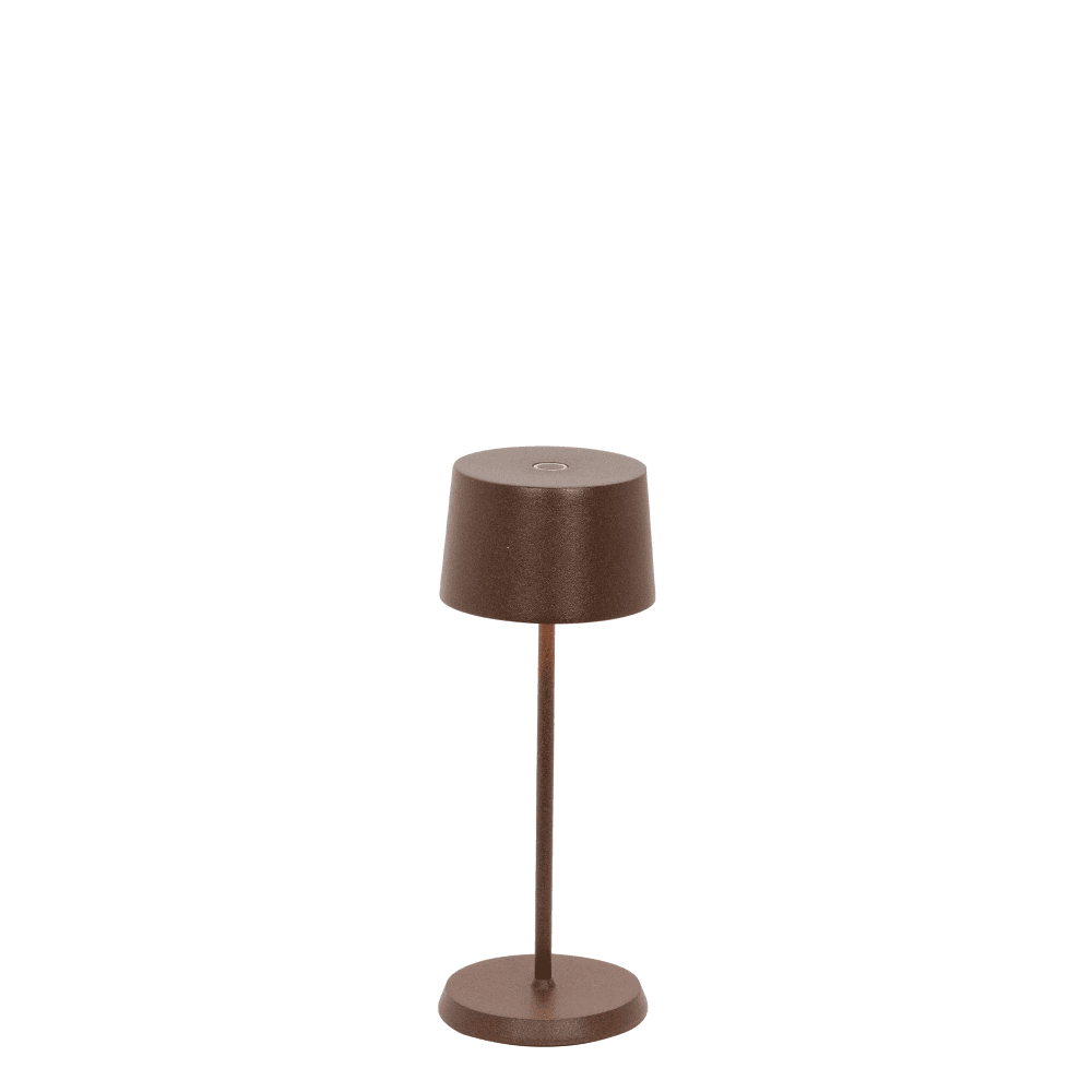 Lampara de mesa recargable para uso exterior / interior, LED 2,2W, blanco calido, 2200K/2700K/3000K, construida en aluminio terminacion corten, difusor en policarbonato opal. Incluye switch dimm, bateria, base de carga 5Vdc max 1A (IP20) .